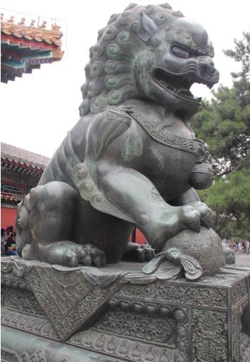 现存的故宫铜狮已成为所有传统狮子造型中的典范,作为皇家守卫门户的瑞兽,它雌雄一,体态壮硕雄健、威锰无比、气势非常。狮头饰鬃髦,颈悬响铃,肌肉发达,气势雄伟。雌狮前左脚下有一幼狮仰卧作嬉戏状,雄狮前右脚抚踩一绣球,底座有繁缛精致的卷叶纹。